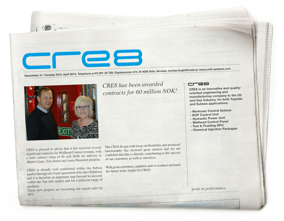 CRE8 is already well established within the Subsea market through our frame agreement with Aker Solutions and it is therefore an important step forward to succeed within the Top side market and for a different range of products.